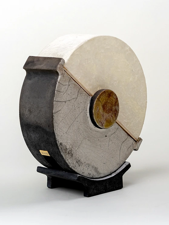 La base semicircolare è realizzata in ceramica Raku a lastre, utilizzando un’antica tecnica di cottura giapponese. Questo pezzo presenta lo stile Raku Occidentale (Western Raku), in cui i colori emergono solo durante la cottura finale, dove il pezzo estratto incandescente prende fuoco, rivelando sfumature uniche e crackle sulla superficie.